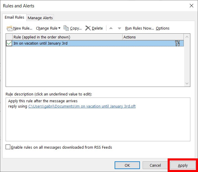 - Finally, click Apply in the Rules and Alerts window and then Ok.